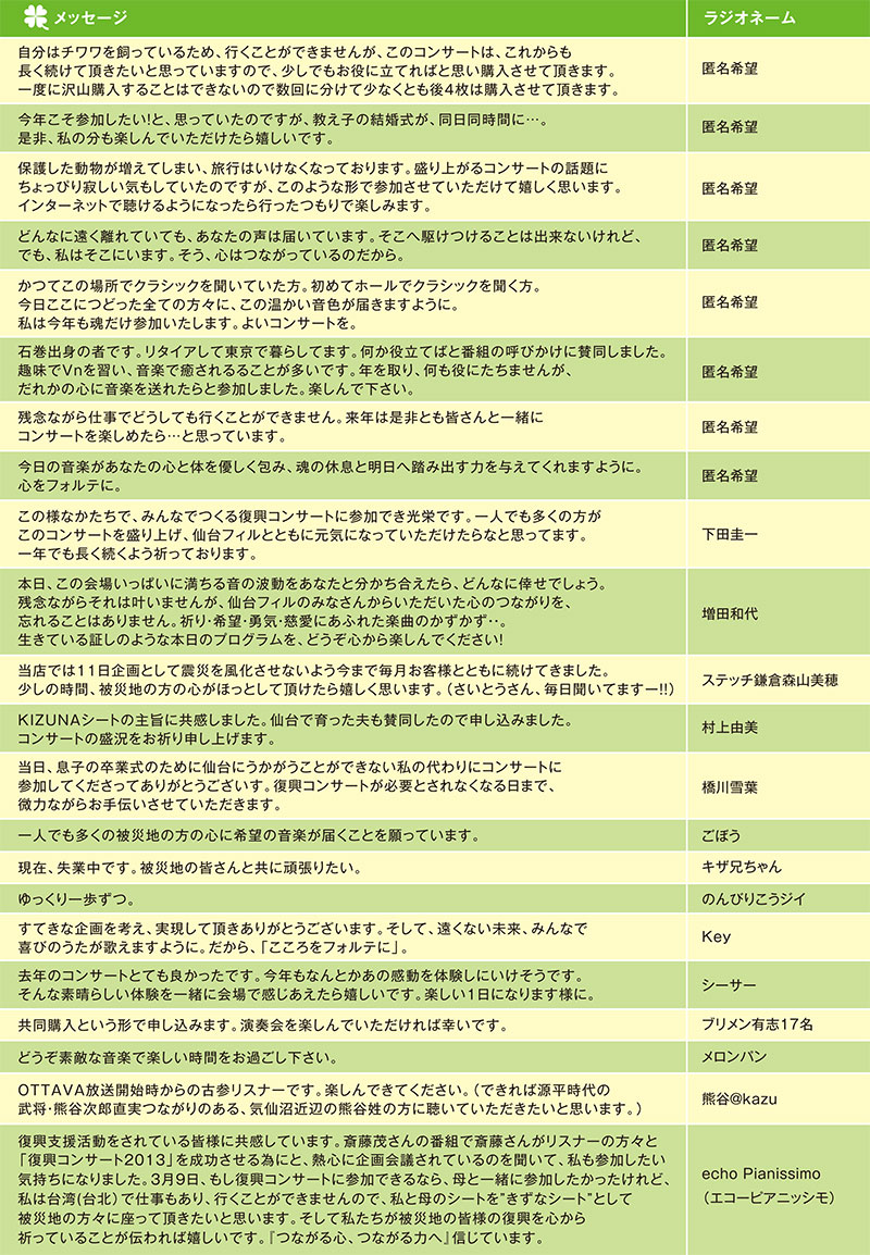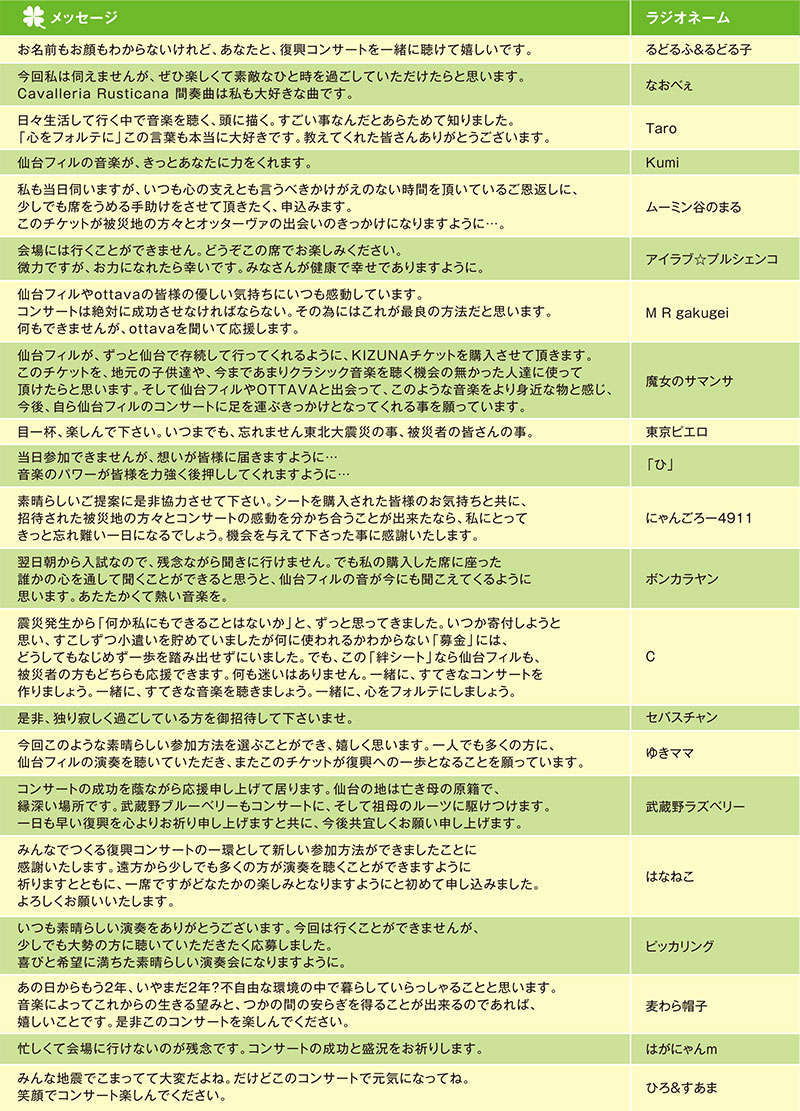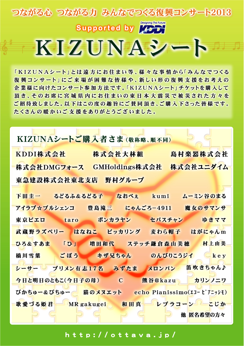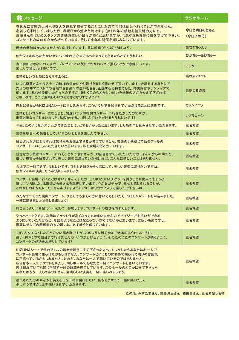 | KIZUNAシートの販売も、インターネットを介さない以下のような方法で再開させていただきました。(2月8日~) KIZUNAシートは、ご都合や、遠方にお住まいのため「みんなでつくる復興コンサート」への参加が難しい方に向けて、新たなコンサートへの参加方法として企画しました。ご自身がコンサートに行けなくても、チケットをご購入していただくことで、その枚数分「仙台フィルがご招待したい被災地の方々」をコンサートへお招きできます。上の「KIZUNAシート」のボタンをクリックしていただくと、チケットお申し込みフォームが表示されます。そのフォームをプリントアウトしていただき、必要事項をご記入ください。そして、フォームの中に記載してあるファックス番号にファックスでお申し込みをお願いいたします。フォームには、その後の料金のお支払いについてや注意事項も記載してあります。必ずお読みください。 ※お名前・お送りいただいたメッセージは番組、会場、ホームページでご紹介をさせていただく予定です。 ------------------------------------------------------- コンサート当日、会場でお配りさせていただいたKIZUNAシートにいただいたメッセージを掲載した冊子「KIZUNAシートメッセージ」に不備があり、一部の方のお名前とメッセージが一致していないことが判明いたしました。 間違ったメッセージが掲載されたみなさまにご迷惑をおかけしたことをお詫びをさせていただくとともに、「KIZUNAシートメッセージ」を訂正し、上記リンクからご覧いただけるよういたしました。 あらためまして、みなさまからの想いのこもったメッセージをご覧いただけますと幸いでございます。 |